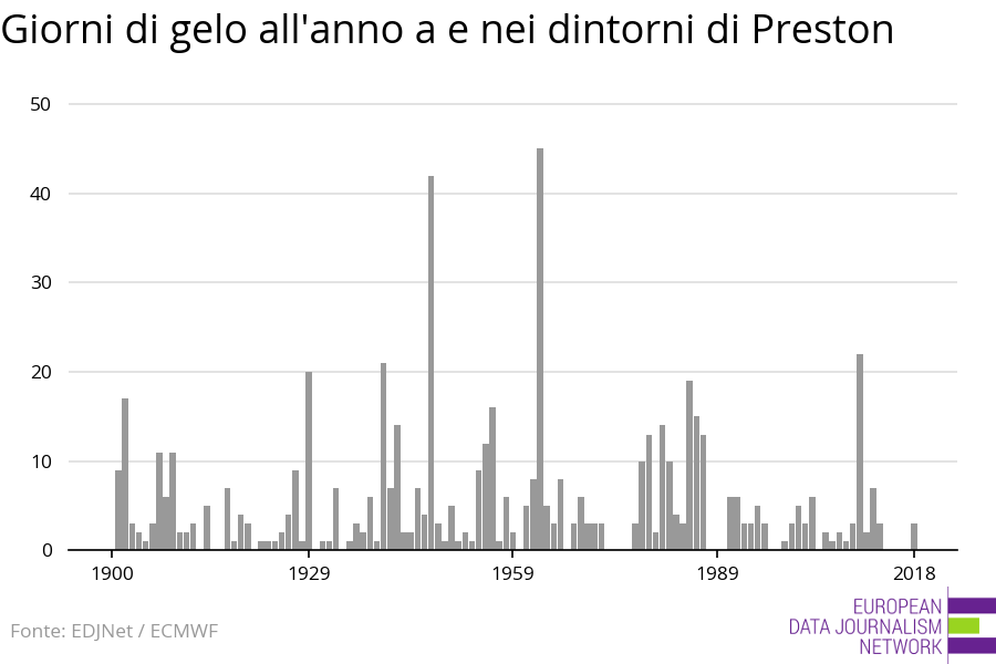 Sfruttando i dati dello European Centre for Medium-Range Weather Forecasts abbiamo analizzato 118 anni di dati meteorologici a e intorno a Preston. La zona in esame comprende anche i dintorni di Preston, e potrebbero comprendere montagne o specchi d'acqua. Di conseguenza, le temperature registrate dalle stazioni meteorologiche di Preston non corrispondono esattamente a quelle delle stazioni meteo di Preston (si veda la metodologia per i dettagli). Ecco cosa abbiamo trovato: